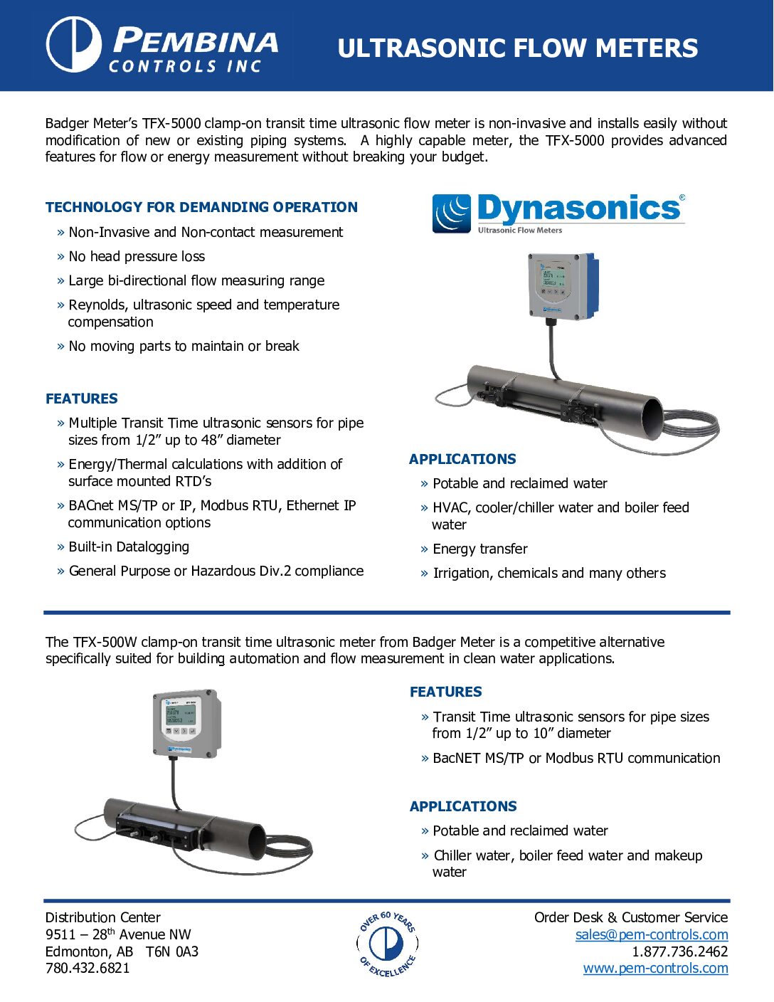 This month we are featuring the Badger Meter Dynasonics TFX-5000 and TFX-500W ultrasonic flow meters. Suitable for many acoustically conductive liquids, Dynasonics meters are highly capable and provide advanced features for water, flow or energy measurement projects.